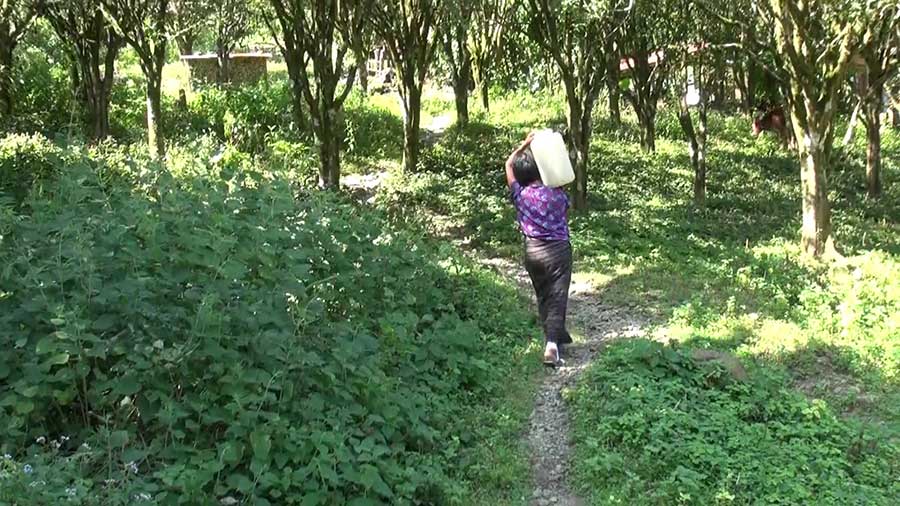 “We have been carrying water like this. There are no other water sources for us. It becomes difficult when we have to perform rituals at home. Soon this source will also dry up and we won’t be able to see a drop of water here,” said Tshomo.