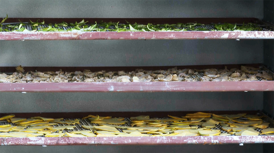 This multipurpose electric dryer, loaded with trays of vegetables, has been running since morning.