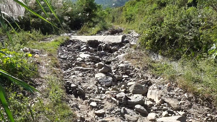 The flash flood completely washed away half of the stretch, leaving the area filled with large holes and boulders. The two-kilometre Jangsalum farm road, which descends from Metsina town, was constructed in 2019. The road runs along a small stream. Locals say the stream had never swollen or caused flash floods in the past, even during prolonged rainfall.