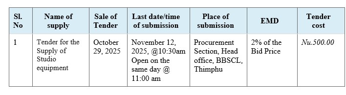 The Bhutan Broadcasting Service Corporation Limited would like to invite sealed quotations from eligible firms for the “Supply of Studio equipment”. The bid details are as follows: