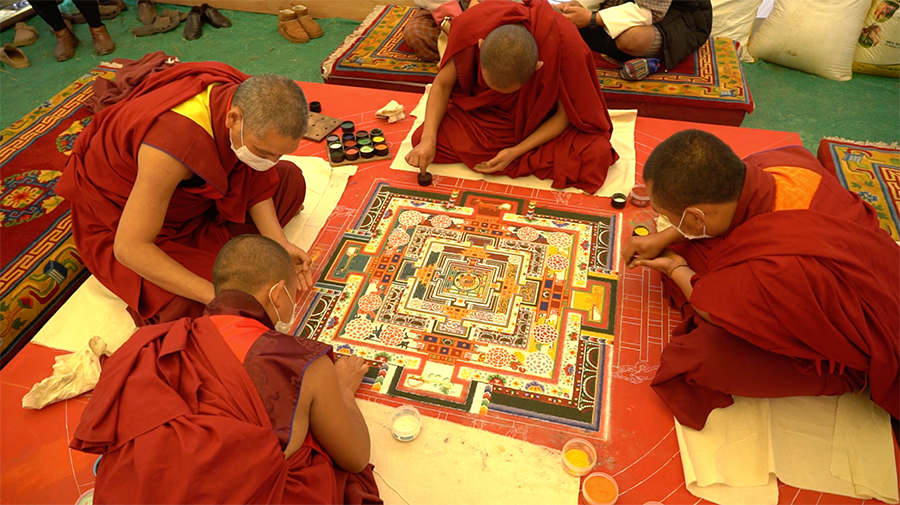 Inside the mandala, painting and sacred sand mandala creation continue in intricate detail.
