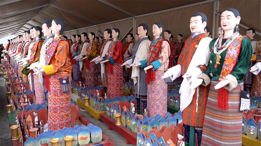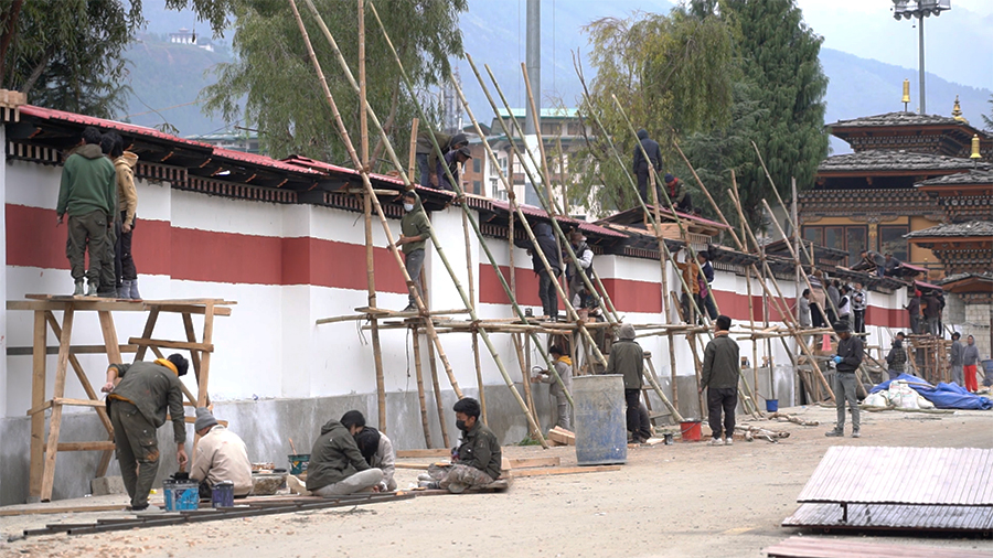 Over in Kuensel Phodrang where Jabzhi Dhoechog will take place as part of the festival, preparations have taken a similar shape. Dhoe, the main structure of the ritual is complete and soaring as high as a 10-storey building dominates the hilltop. What remains is the installation of the hundred life-sized effigies surrounding the sacred monument.
