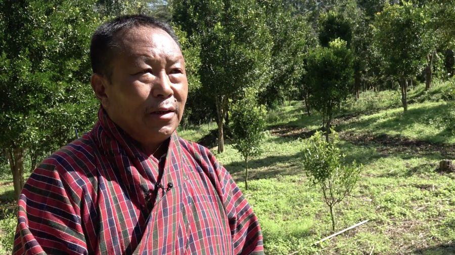 57-year-old Mendrelgang Gup Yeshi, inspects his orange orchard in one of the most fertile regions in the country.