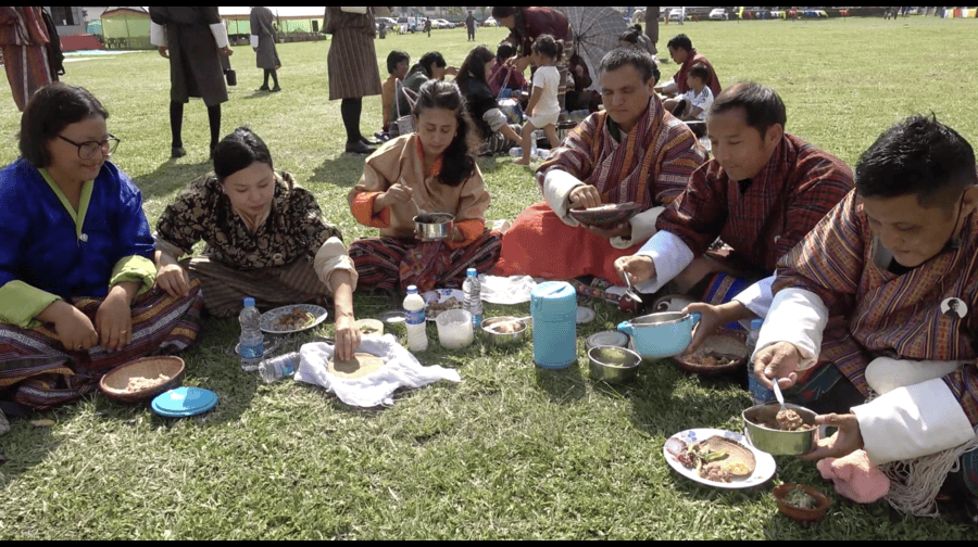 Nima, a resident said, “It’s a very different experience this time, bringing our own packed lunches in the form of Tomza and having it among the people in front of His Majesty’s portrait. It feels wonderful to share a meal with friends and family like this.”