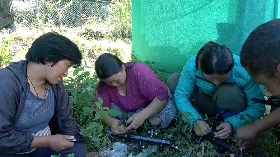 These are the women of Phadi village in Khar Gewog in Pema Gatshel. They are fitting the rotator onto a mini power tiller to plough their fields. Since these machines are user-friendly and light, women no longer have to wait for men to operate them. As seen here, the machine is being handled with ease by the women themselves.
