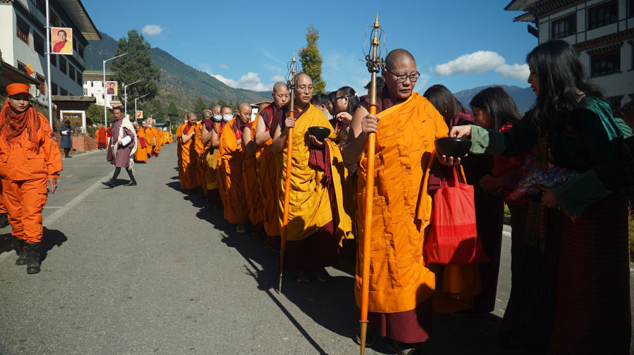 Thimphu’s bustling streets fell into quiet reverence today as 265 ordained nuns from Bhutan and 14 other countries, ordained by His Holiness the Je Khenpo, walked through the capital for an alms round. Devotees lined the streets with offerings, prayers, emotions and heartfelt contributions