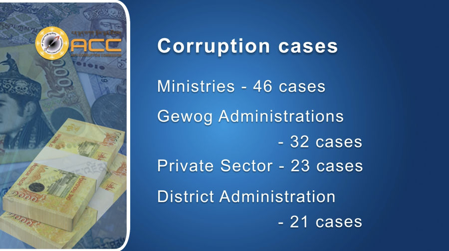 According to the report, ministries recorded the highest number of corruption cases, followed by Gewog Administrations with 32 cases. The Private Sector and District Administrations accounted for 23 and 21 cases respectively, while Religious Organisations and Constitutional Offices reported the fewest cases.