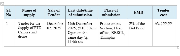 The Bhutan Broadcasting Service Corporation Limited would like to invite sealed quotations from eligible firms for the “PTZ Camera and drones” supply. The bid details are as follows: