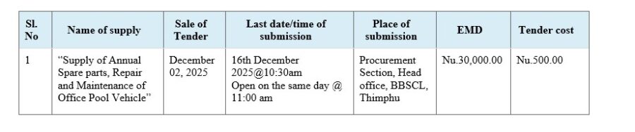 The Bhutan Broadcasting Service Corporation Limited would like to invite sealed quotations from the eligible firms for the “Supply of Annual Spare parts, Repair and Maintenance of Office Pool Vehicle”. The bid details are as follows: