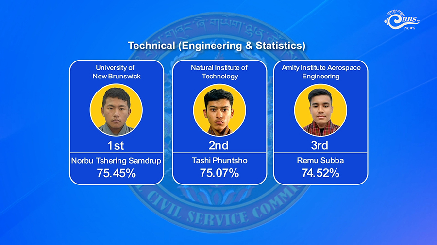 Norbu Tshering Samdrup from University of New Brunswick topped the Technical (Engineering and Statistics) category with 75.45 per cent.