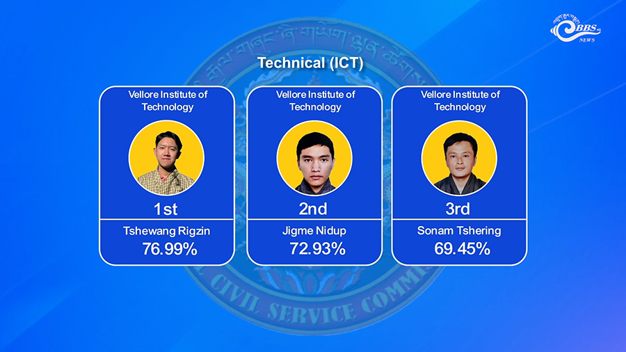 And in the Technical (ICT) category, Tshewang Rigzin from Vellore Institute of Technology in India secured the top position with 76.99 per cent.