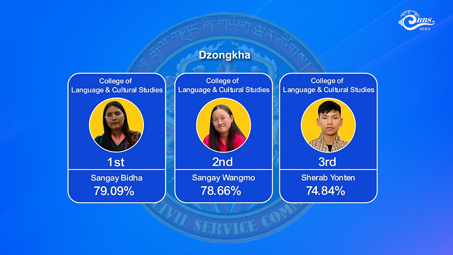 Likewise, in the Dzongkha category, Sangay Bidha from the College of Language and Culture Studies, achieved the top position with 79.09 per cent.
