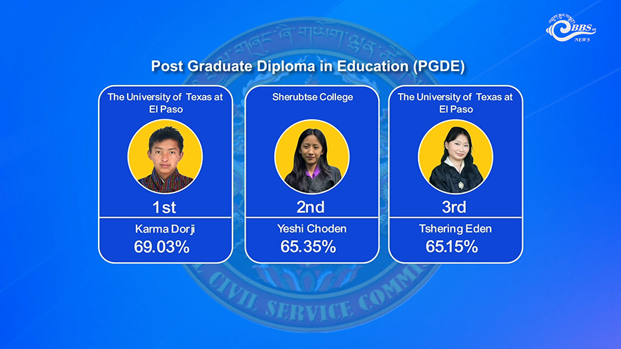 Securing 69.03 per cent, Karma Dorji from University of Texas at El Paso in the United States topped the Post Graduate Diploma in Education (PGDE) category.