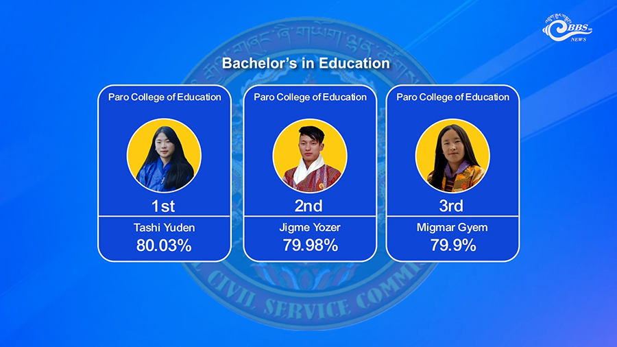 And Tashi Yuden from Paro College of Education stood as the top scorer in the Bachelor’s of Education category with 80.03 per cent.