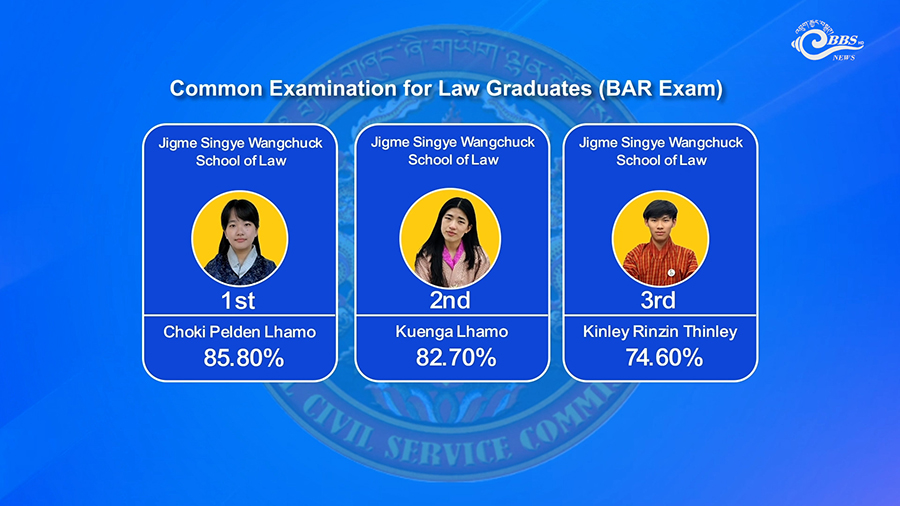 In the Common Examination for Law Graduates Category, Choki Pelden Lhamo from Jigme Singye Wangchuck School of Law topped the category with 85.8 per cent.