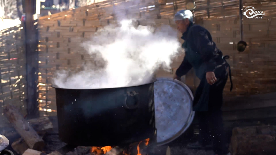In the nearby kitchen, large pots simmer as steam rises into the cold winter air.