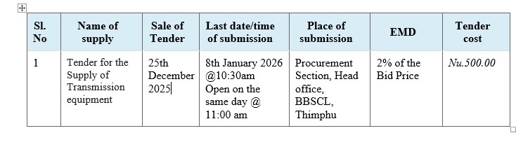 The Bhutan Broadcasting Service Corporation Limited would like to invite sealed quotations from eligible firms for the “Supply of Transmission equipment”. The bid details are as follows: