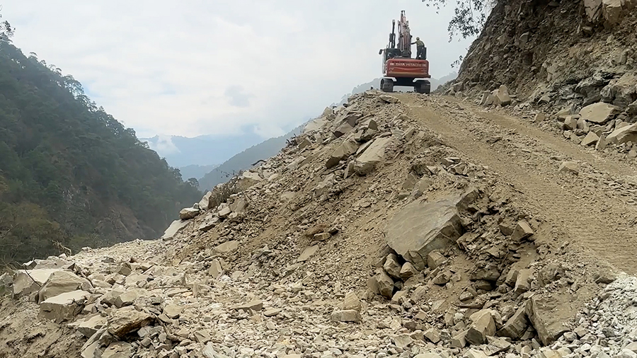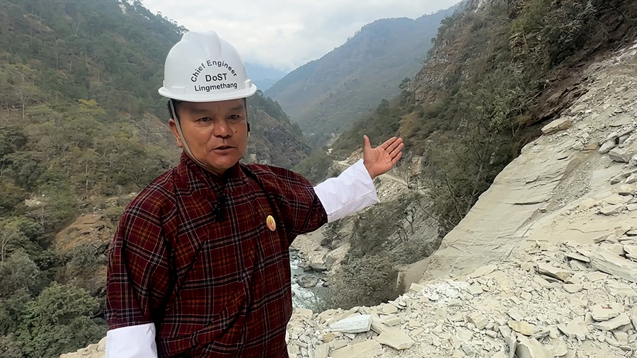 “I am standing about 20 metres above the existing road. Earlier, there was a narrow bridge across this gorge. It was built because the base of the cliff was not secure. We are now cutting through a rocky surface stretching nearly 100 metres to level it with the existing road. Once this work is complete, we will reopen the road to traffic as usual,” said Kinzang Dorji, the chief engineer with Lingmethang Regional Office, Department of Surface Transport.