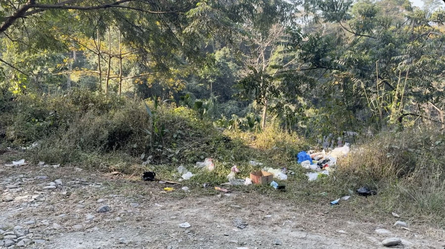 The waste issue stretches far beyond the town. Nearly three kilometres away, along the Rinchending road, garbage bags and cartons overflowing with waste are dumped openly by the roadside.