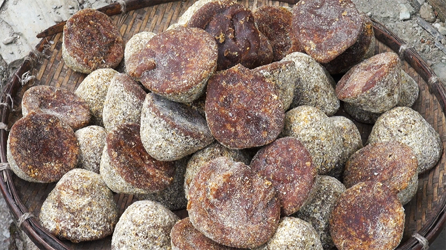 Sugarcane juice is boiled for around six hours for purification until it thickens and solidifies. The thickened sugar is then poured into conical shapes to make jaggery, which is sold for Nu 50 per piece in Wamrong town and nearby districts.