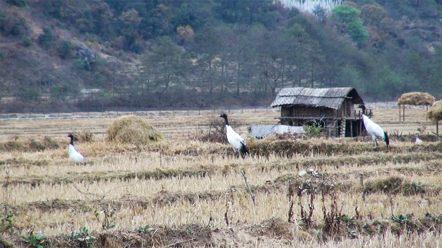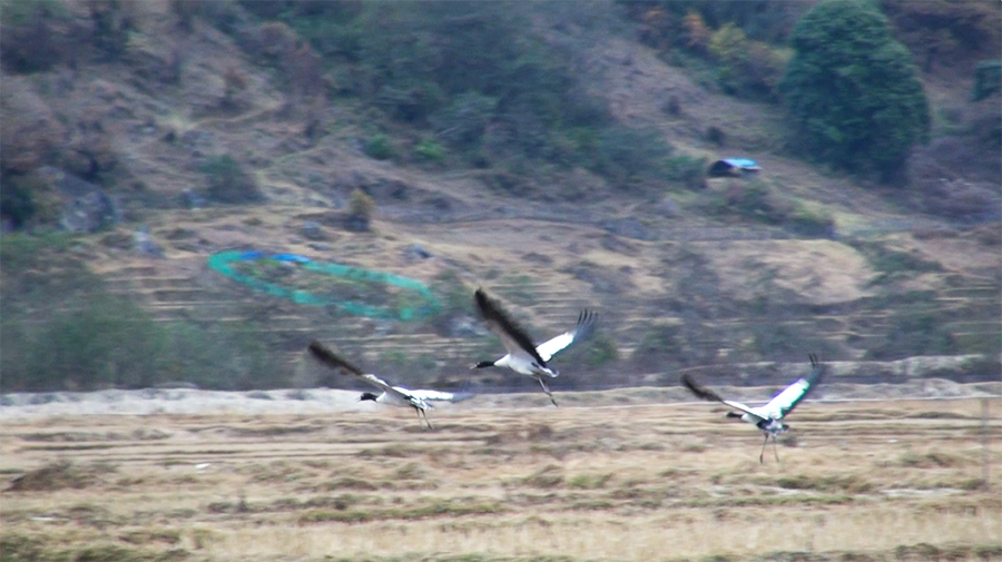 Each year, black-necked cranes arrive at their winter roosting grounds in Bumdeling in October.