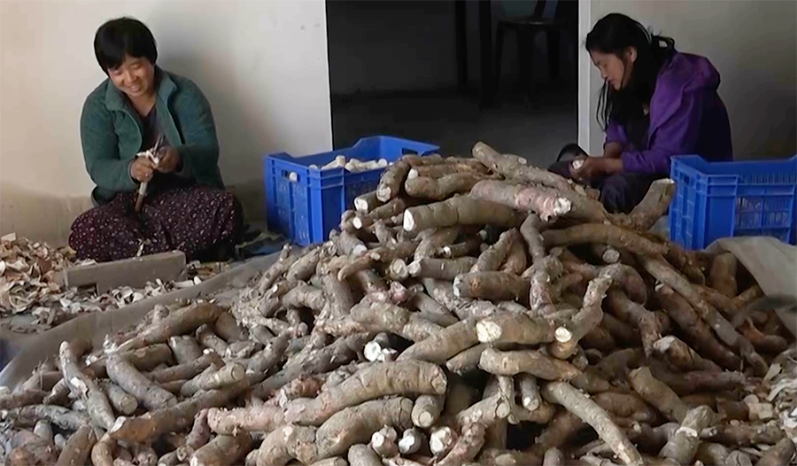 These are members of Green Hill Firm, peeling cassava for flour production. Established ten years ago, the group has continued production despite a manpower shortage.