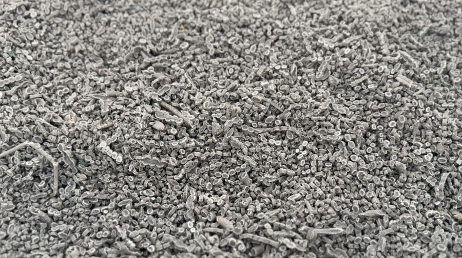 Plastics are washed, cleaned and shredded into small flakes, which are then left to dry.