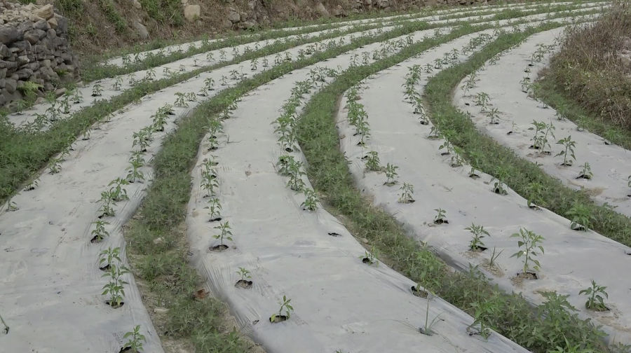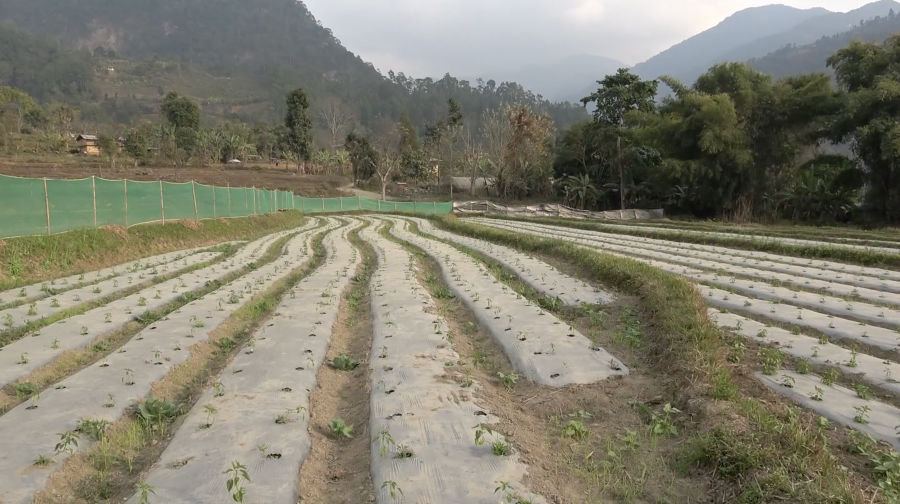 Fields in Tashithang Chiwog are fully covered with mulching plastics, thanks to support from the Advancing Climate Resilience of Water Sector Project. The distribution of mulching plastics since last year has encouraged more farmers to take up chilli cultivation.
