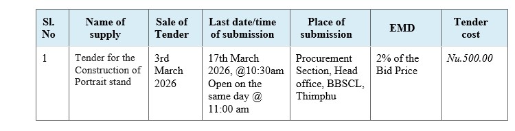 The Bhutan Broadcasting Service Corporation Limited would like to invite sealed bids from eligible firms holding valid small-scale trade licenses for the “Construction of Portrait Stand’’.