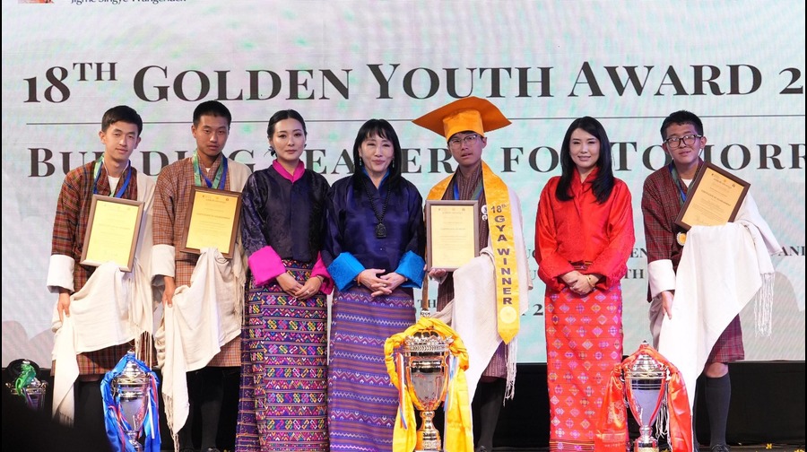 Yangtshel Wangyel, a student of the Royal Academy in Paro, has won the 18th Golden Youth Award 2026. He stood out among 80 participants from 20 districts and will receive a scholarship to continue his studies abroad. Her Majesty Queen Mother Tseyring Pem Wangchuck, along with members of the Royal Family, graced the closing ceremony.