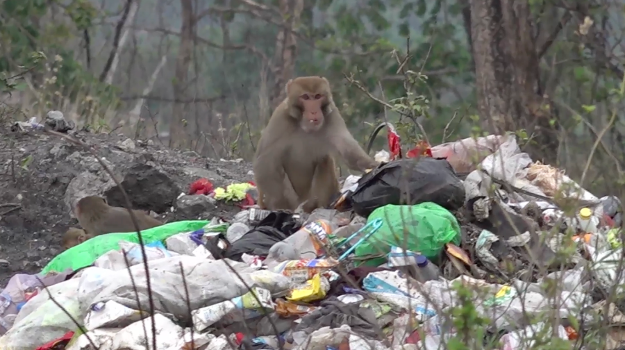 Waste dumped along the roadside attracts monkeys, which are often seen feeding on it.