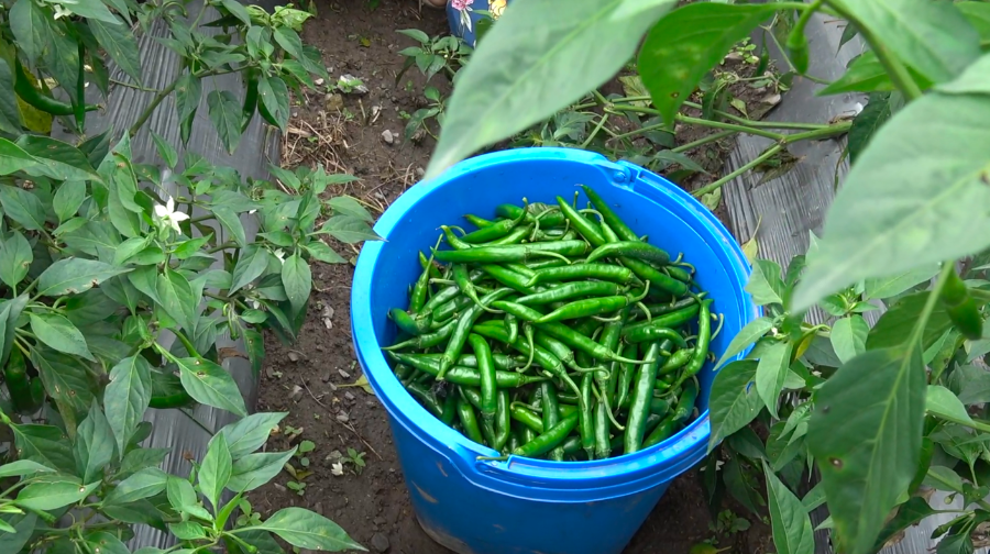 Farmers move through the rows, carefully plucking fresh green chillies and filling their buckets. They sort and prepare the produce for the market.