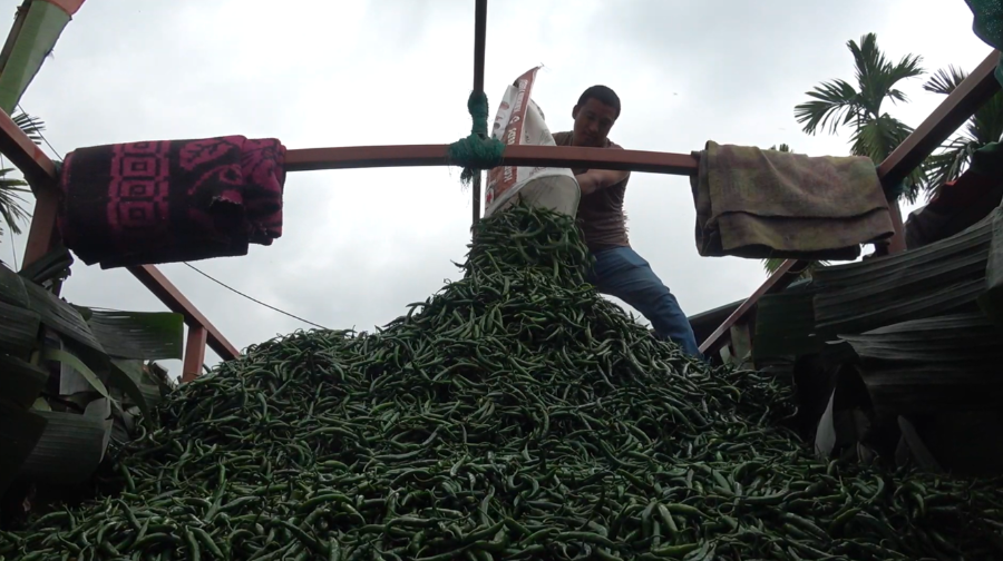 Harvesting continues beyond the fields, as families sort, weigh, and pack chillies at home before loading them onto trucks. The produce is then transported to Lingmethang for processing into pickles.